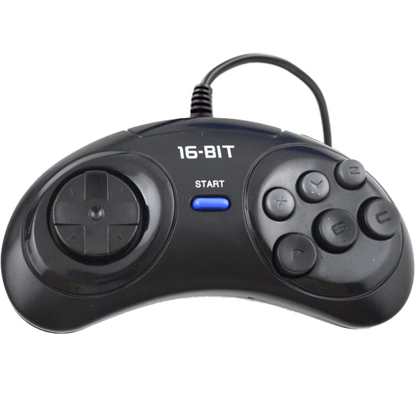 Стандартный шести кнопочный джойстик Sega чёрного цвета. Подходит на все виды 16-ти битные приставки Sega.